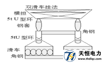 1、耐張塔邊相的滑車用U型環(huán)、Φ19.5(長2m)鋼套掛在導線橫擔靠掛線點附近的主材上,掛具長度以不會撞擊瓷瓶、鐵塔橫擔為好。